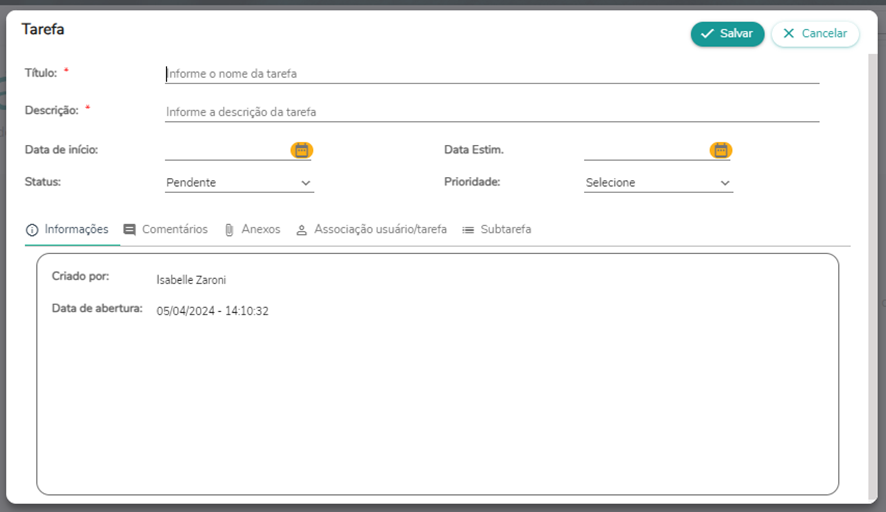 Descrição: Campo destinado para descrever a tarefa a ser criada (Campo obrigatório).