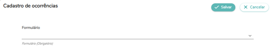 Para cadastrar uma nova ocorrência, deve-se clicar no ícone Cadastro de ocorrência. Após isso, será necessário selecionar o formulário para registro da ocorrência e preencher as informações solicitadas, que se alteram de acordo com o formulário adicionado. Em seguida, deve-se clicar no ícone Salvar para registrar a ocorrência.