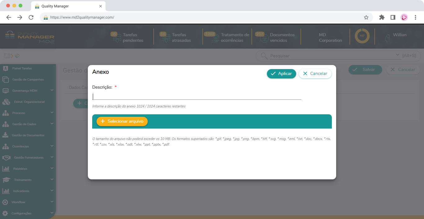O tamanho do arquivo não poderá exceder os 10 MB. Os formatos suportados são: *.gif, *.jpeg, *.jpg, *.png, *.bpm, *.tiff, *.svg, *.msg, *.eml, *.txt, *.doc, *.docx, *.rtx, *.rtf, *.csv, *.xls, *.xlsx, *.odt, *.xlw, *.ppt, *.pptx, *.pdf.