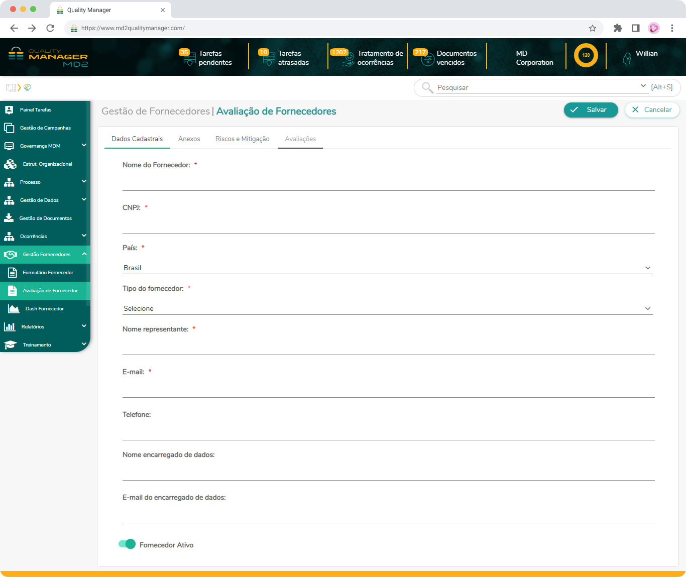 Cadastrar fornecedores, avaliar realizar avaliações, adicionar riscos e anexar documentos relacionados a cada fornecedor.