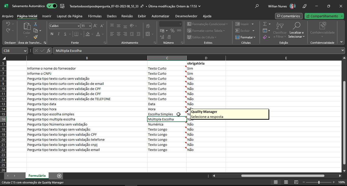 - Cada célula da coluna vem com um comentário com instruções para o preenchimento da resposta.