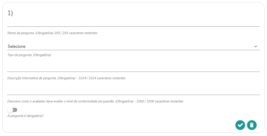 A pergunta é obrigatória?: Acione a flag caso a pergunta em questão seja de preenchimento obrigatório. Caso o respondente não coloque nenhuma informação no campo, não será possível enviar a avaliação.