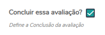 Para concluir, é necessário clicar no checkbox "Concluir essa avaliação?" e depois clicar em salvar. Com isso, a avaliação fica bloqueada para edição, apenas disponível para visualização.