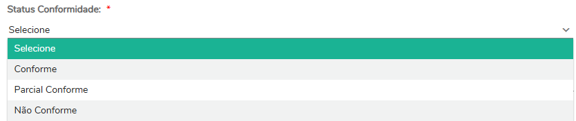 Avaliação: Na aba de avaliação, são exibidos informações gerais do formulário, além de todas as seções com as perguntas, respostas, critérios de avaliação e o campo para marcar o status de conformidade.