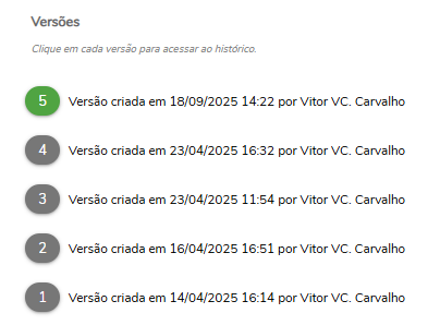 OBS: A aba versões só será exibida quando a avaliação já tiver sido utilizada, caso ainda esteja sem vínculos com processos, o usuário pode alterar/editar a versão vigente.
