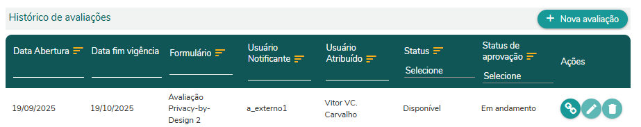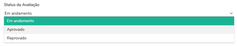 A avaliação pode ser marcada como Aprovada ou Reprovada, direcionando o fluxo subsequente do processo de tratamento de dados. Enquanto estiver sendo analisada, é importante mantê-la Em andamento.