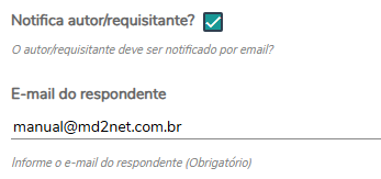 Caso queira alterar o e-mail para a mensagem, o usuário deve clicar no checkbox "Notifica autor/requisitante?". Para que seja exibido o campo de preenchimento de e-mail.