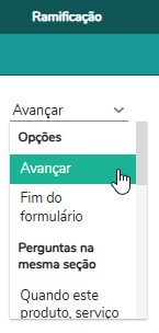 Ramificação: Avançar, Fim do formulário, Perguntas da mesma seção e Perguntas de outra seção (Quando existirem).