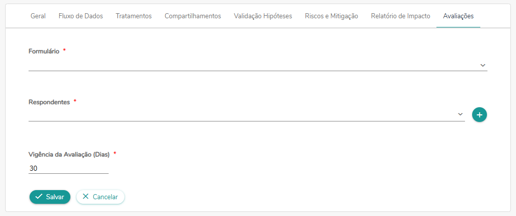 Com seu processo de tratamento de dados aberto, você deve acessar a aba "Avaliações". Os próximos passar são, primeiro escolher o formulário de avaliação que irá utilizar, adicionar os respondentes da avaliação e informar a vigência da avaliação.