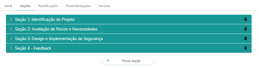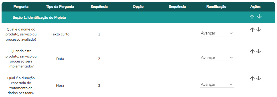 OBS: Qualquer alteração na ordenação de seções, perguntas ou opções irá RESETAR toda a configuração associada a ramificação.