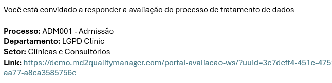 Após o disparo da avaliação, o(s) destinatário(s) terão acesso ao link para realizarem o preenchimento.