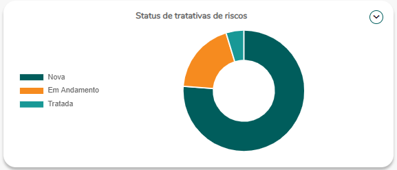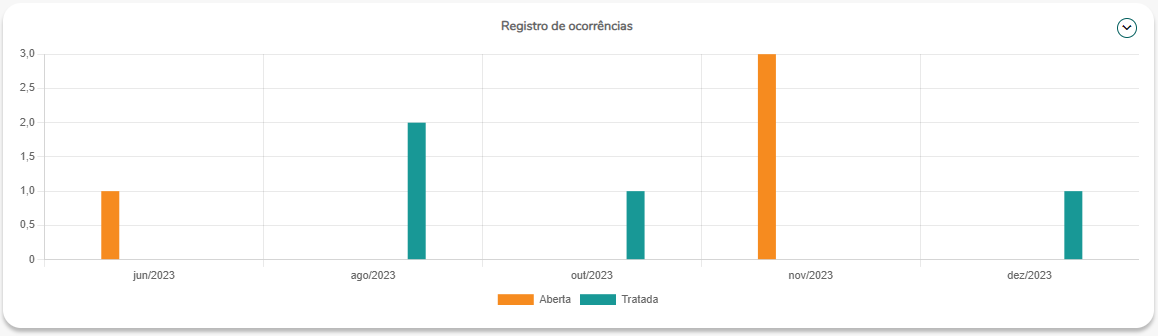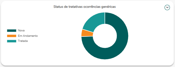 Gráfico que indica, status das ocorrências existentes durante o período selecionado no campo de filtros. Elas podem ser classificadas em: "Nova", "Em andamento" e "Tratada" no Quality Manager.
