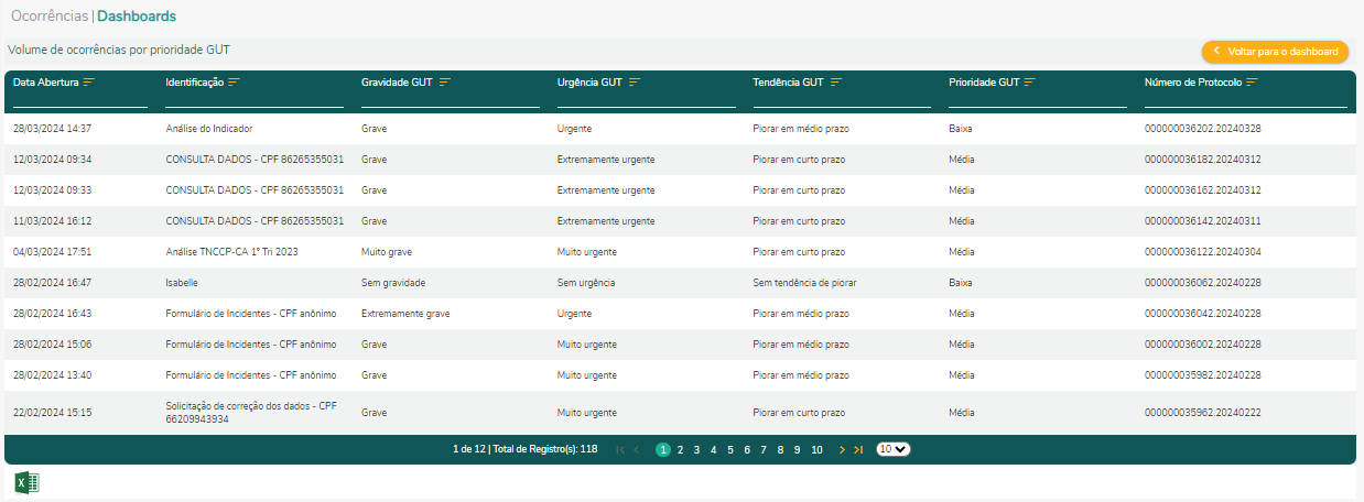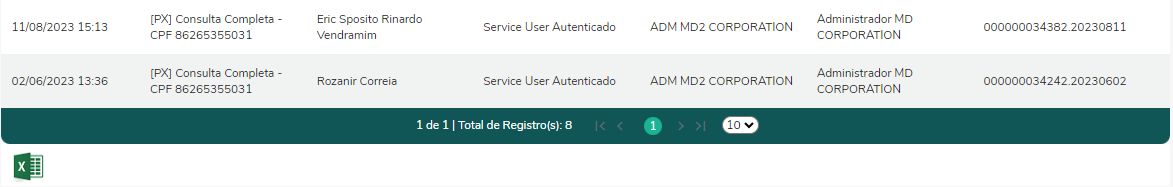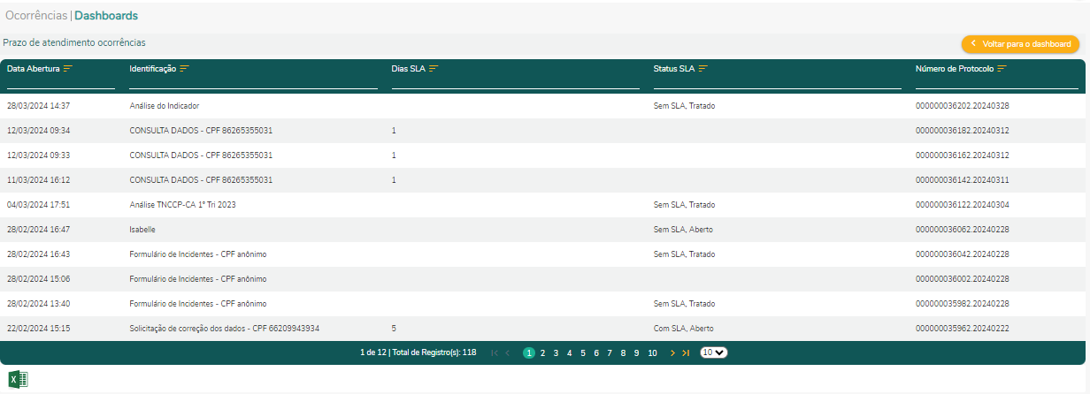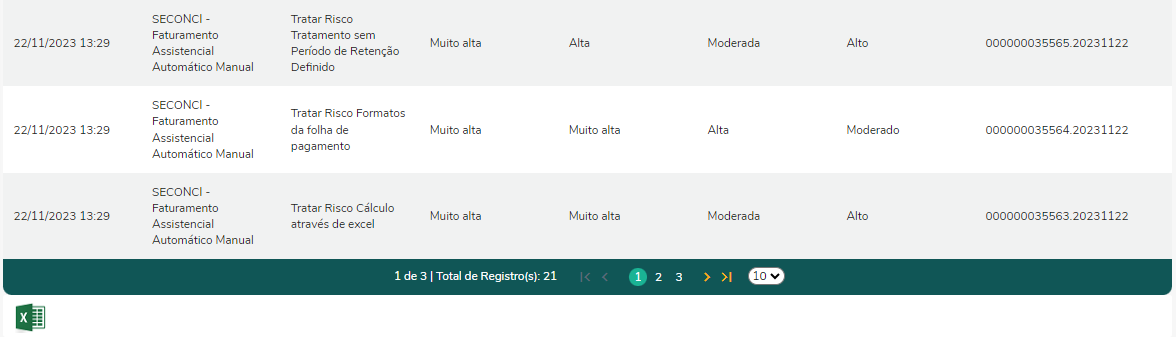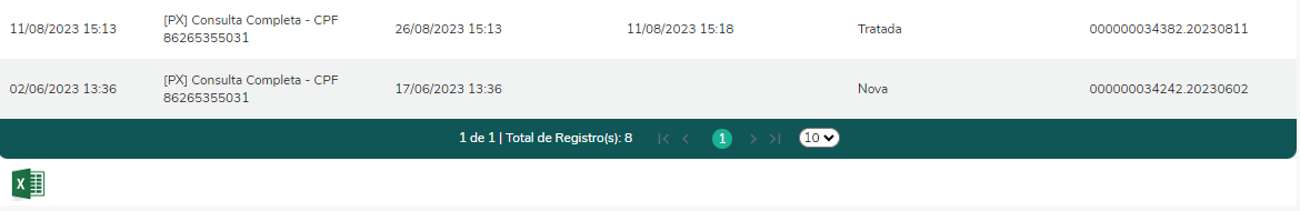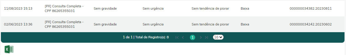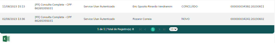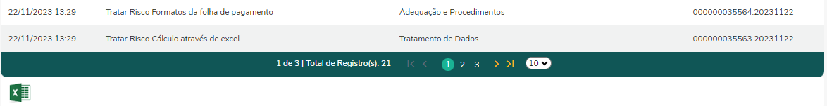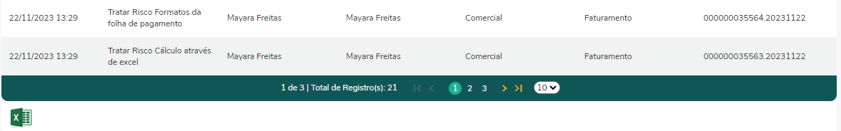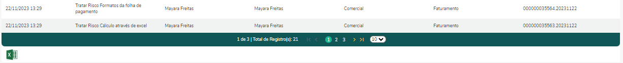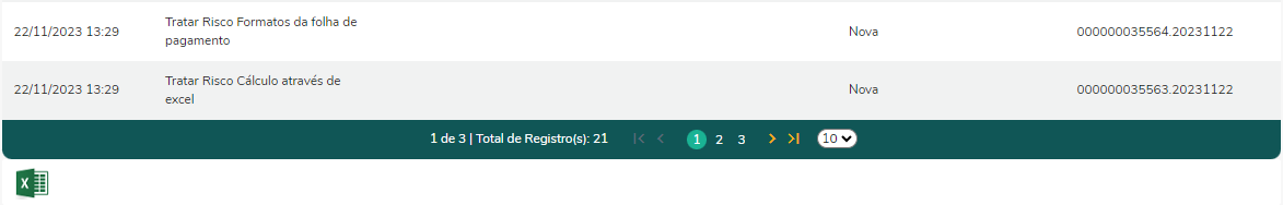 Ao final da página é possível Exportar dados para o Excel, clicando no ícone do excel ao final da página à esquerda.
