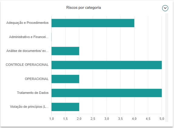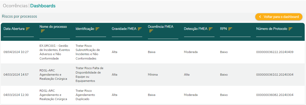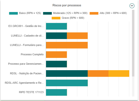 Gráfico que indica, por processos no eixo y, e em tipo de classificação de risco no eixo x, ocorrências abertas durante o período selecionado no campo de filtros. Os tipos de prioridade podem ser classificados como: "Baixo", "Moderado", "Alto", "Grave".