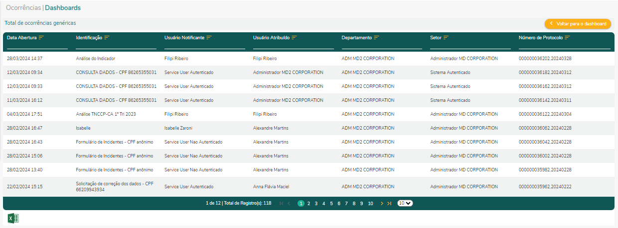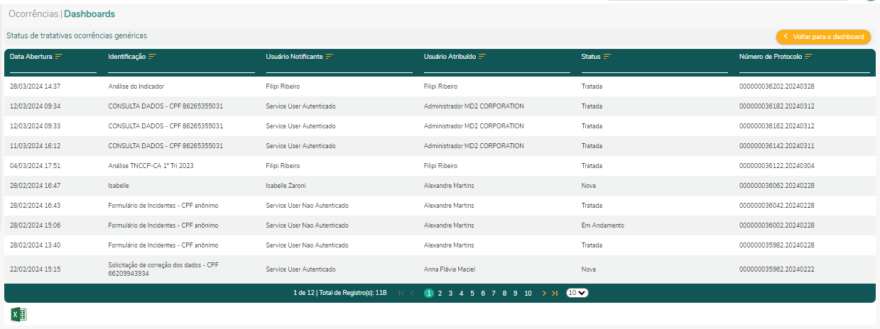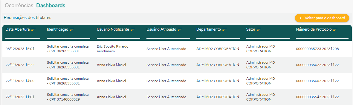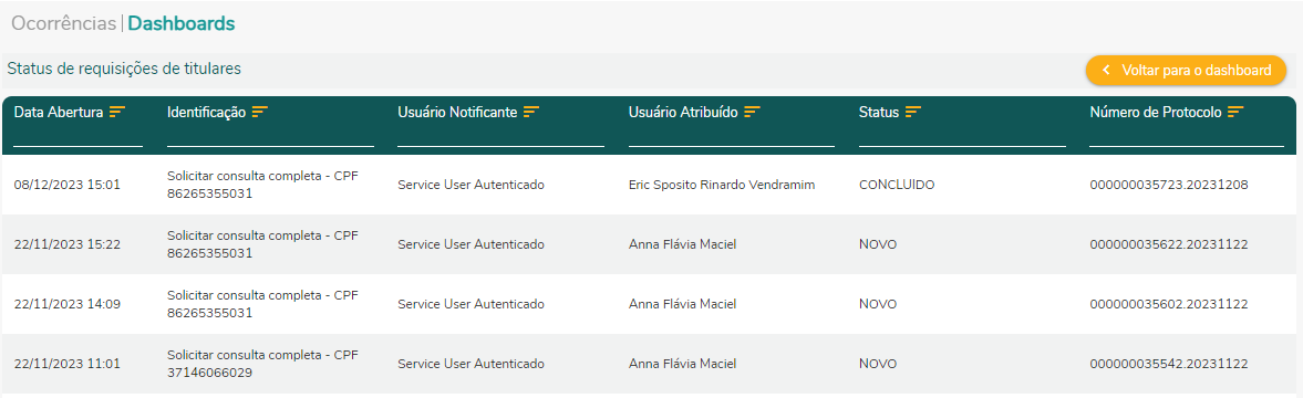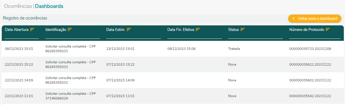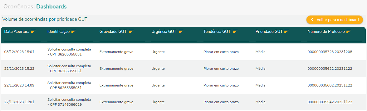 Com o dashboard de ocorrências espera-se que o usuário possa visualizar as ocorrências por tipo, assim como prazo das ocorrências, volume etc.