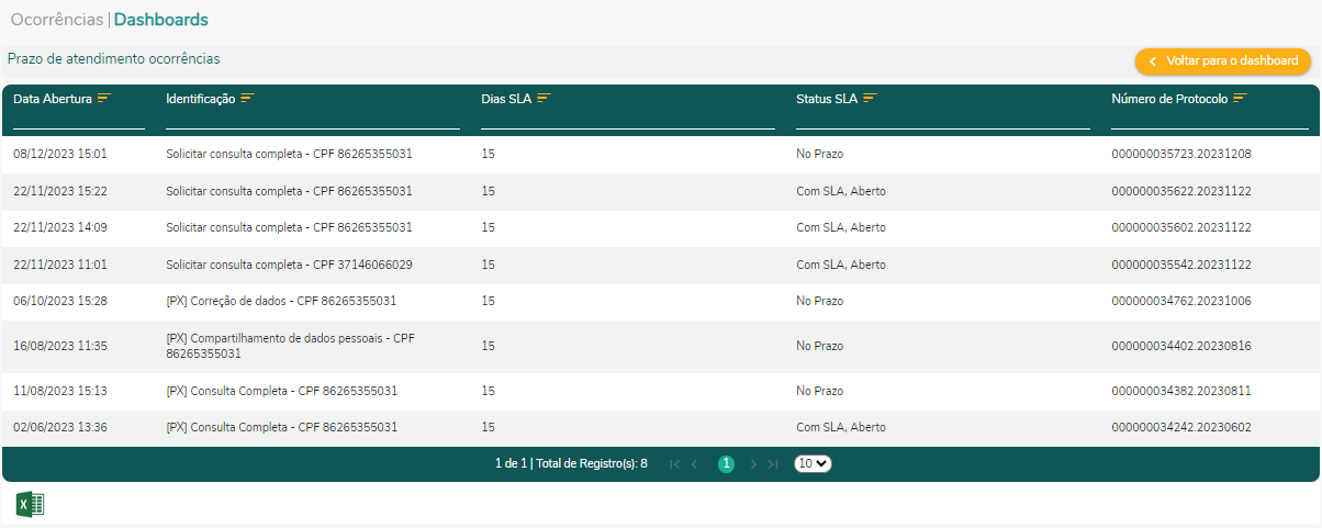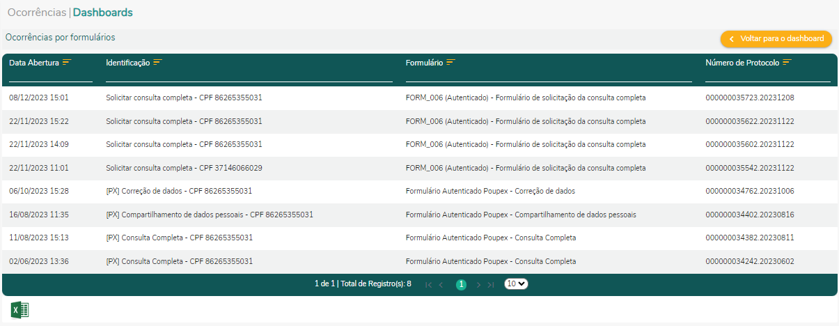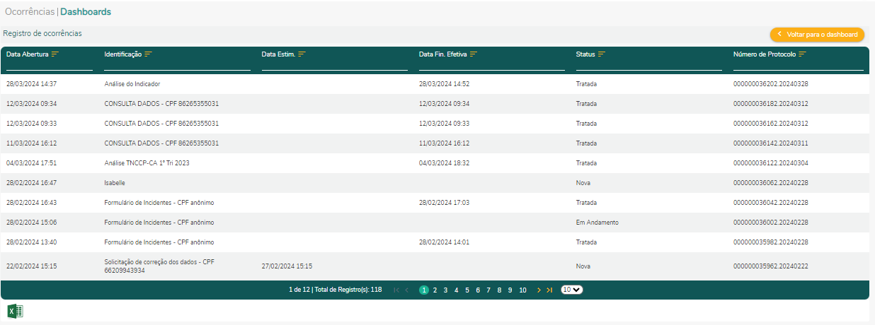 Ao clicar em Exportar dados, será feito o download da planilha em excel.