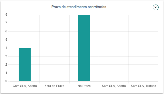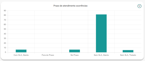 Gráfico que indica, em quantidade de tratamentos no eixo y, e em status de atendimento do tratamento no eixo x, ocorrências tratadas durante o período selecionado no campo de filtros. Os status de atendimento são classificados em: "Com SLA aberto", "Fora do prazo", "No prazo", "Sem SLA aberto", "Sem SLA tratado".