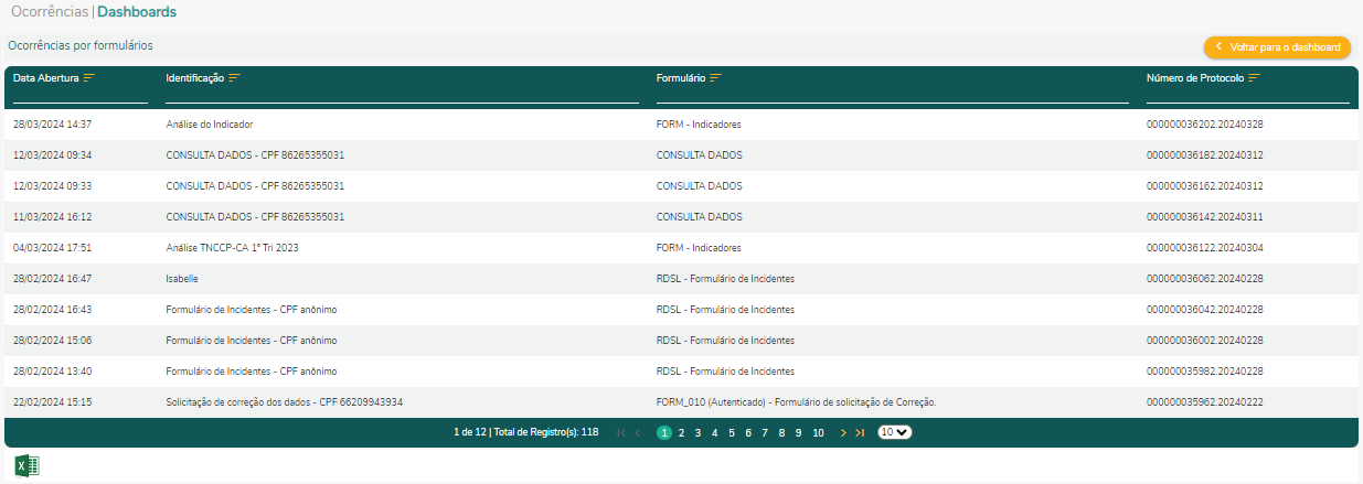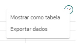 é possível selecionar as opções Mostrar como Tabela ou Exportar dados. Para voltar ao gráfico, clicar em Voltar para o Dashboard.