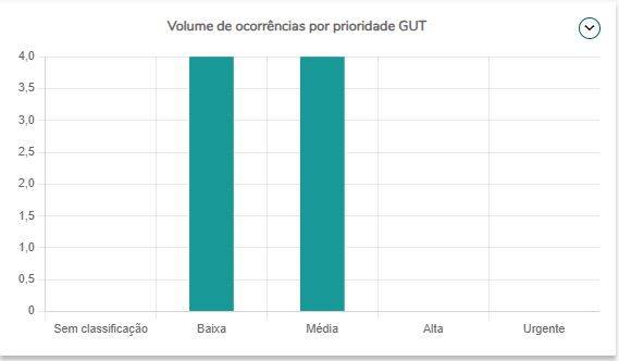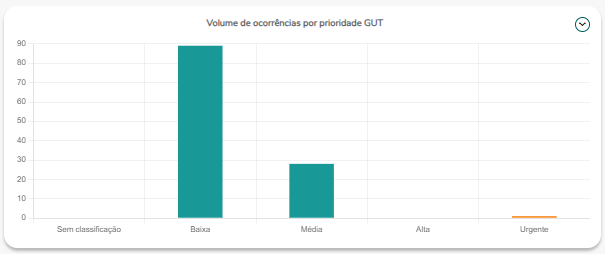 Gráfico que indica, em volume de ocorrências no eixo y, e em tipo de prioridade no eixo x, ocorrências abertas durante o período selecionado no campo de filtros. Os tipos de prioridade podem ser classificados como: "Baixa", "Média", "Alta", "Urgente" e até mesmo "Sem Classificação".