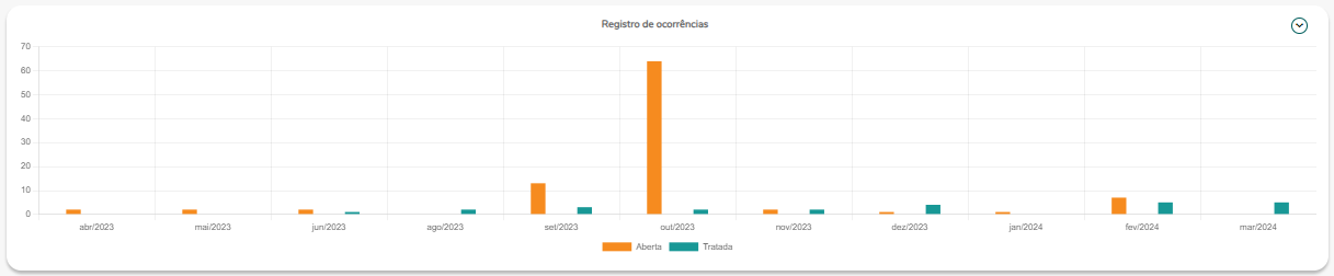 Gráfico que indica, em quantidade de aberturas e tratamentos no eixo y, e em data de abertura e tratamento no eixo x, ocorrências abertas e tratadas durante o período selecionado no campo de filtros.