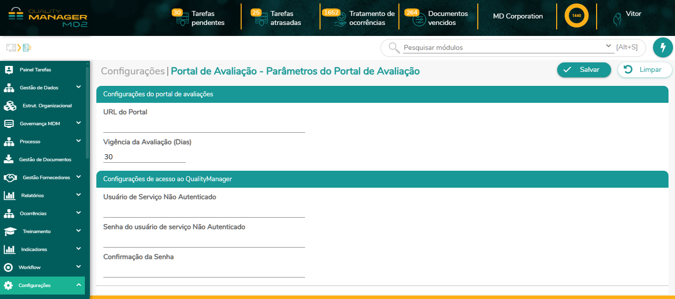 URL do Portal: Inserir a URL do portal de avaliação definido pela empresa. Ex: https://qm.dominio.com/portal-avaliacao-ws/