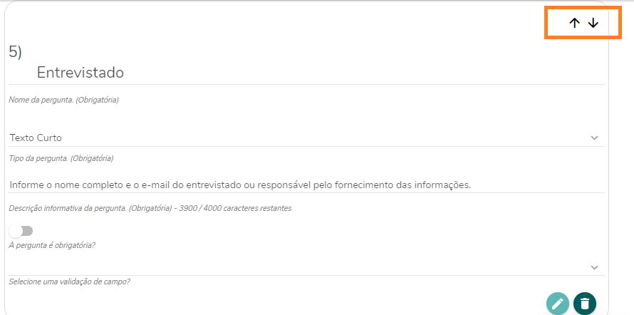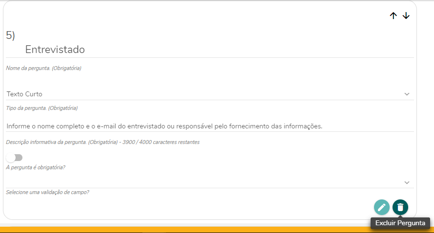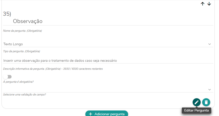 Algumas perguntas são bloqueadas para edição, pois são utilizadas por padrão para alimentação e exibição nos Dashboards do sistema. Elas vem, por padrão, sem o ícone de edição.