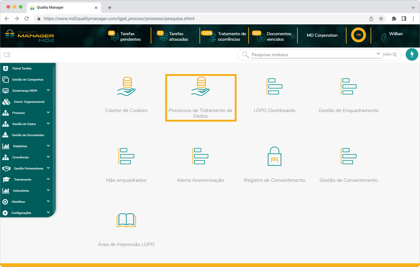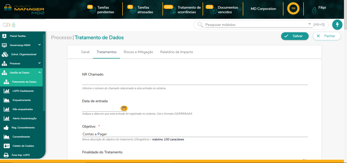 Um dos principais módulos do MD2 Quality Manager. É através deste módulo, que o usuário poderá documentar todo o fluxo de dados com seus diversos tratamentos, compartilhamentos e hipóteses legais. Nele o usuário deverá ser o mais específico possível para documentar e evidenciar com exatidão o cenário daquele tratamento. Caso seja identificado algum risco o mesmo deverá ser registrado e classificados de acordo com a escala FMEA para Gravidade, Ocorrência e Detecção. Sempre que possível, juntamente ao registro do risco, é indicado informar o plano de mitigação.