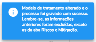 "Modelo de tratamento alterado e o processo foi gravado com sucesso. Lembre-se, as informações anteriores foram excluídas, exceto as da aba Riscos e Mitigação."