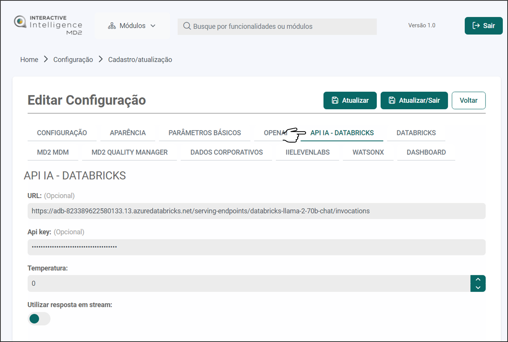 - URL: Campo destinado à seleção do modelo da Databricks a ser utilizado no MD2 Interactive Intelligence. Cada modelo na Databricks utiliza uma URL diferente;