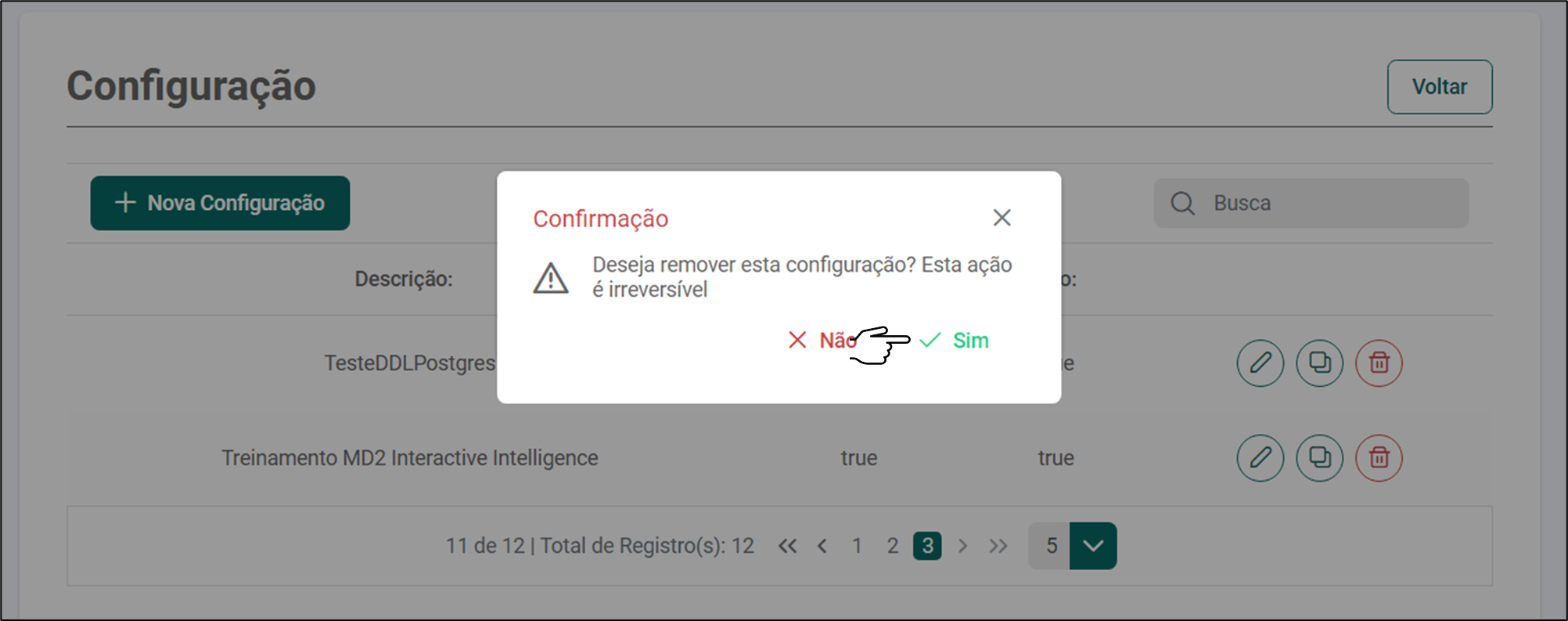 Em seguida, aparecerá uma tela para confirmar a exclusão de uma ou mais configurações. Caso o usuário deseje prosseguir com a exclusão, basta clicar no botão Sim.