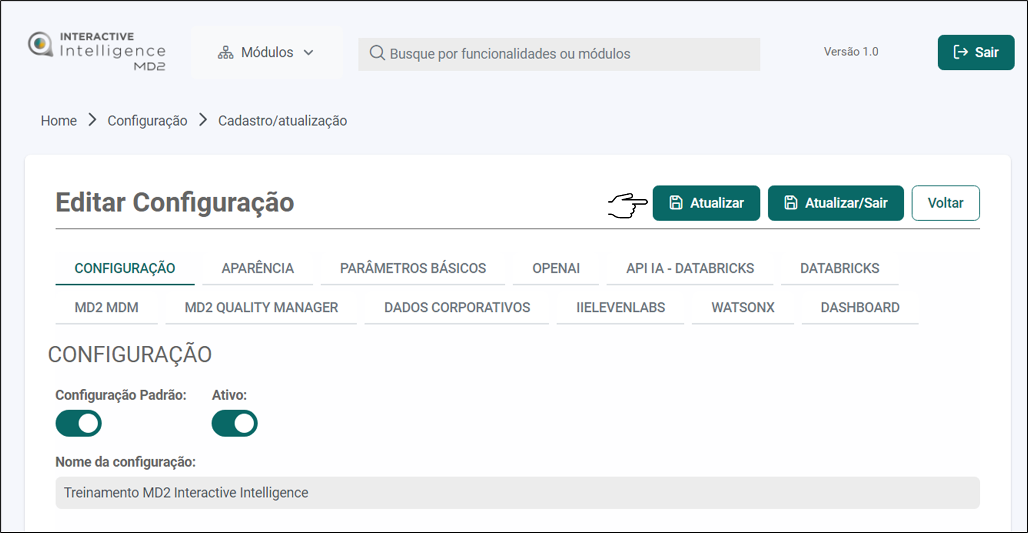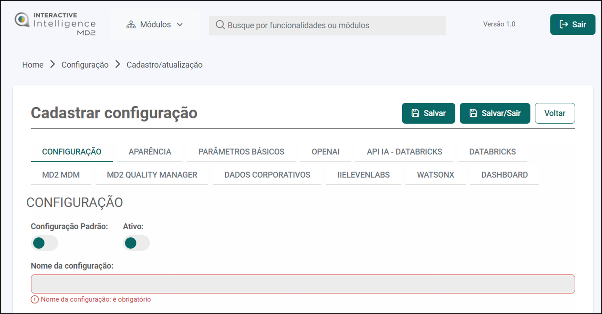 Descrição: O MD2 Interactive Intelligence disponibiliza uma interface para o cadastro das configurações ou parâmetros da aplicação. As configurações estão visíveis somente para usuários do perfil admin.