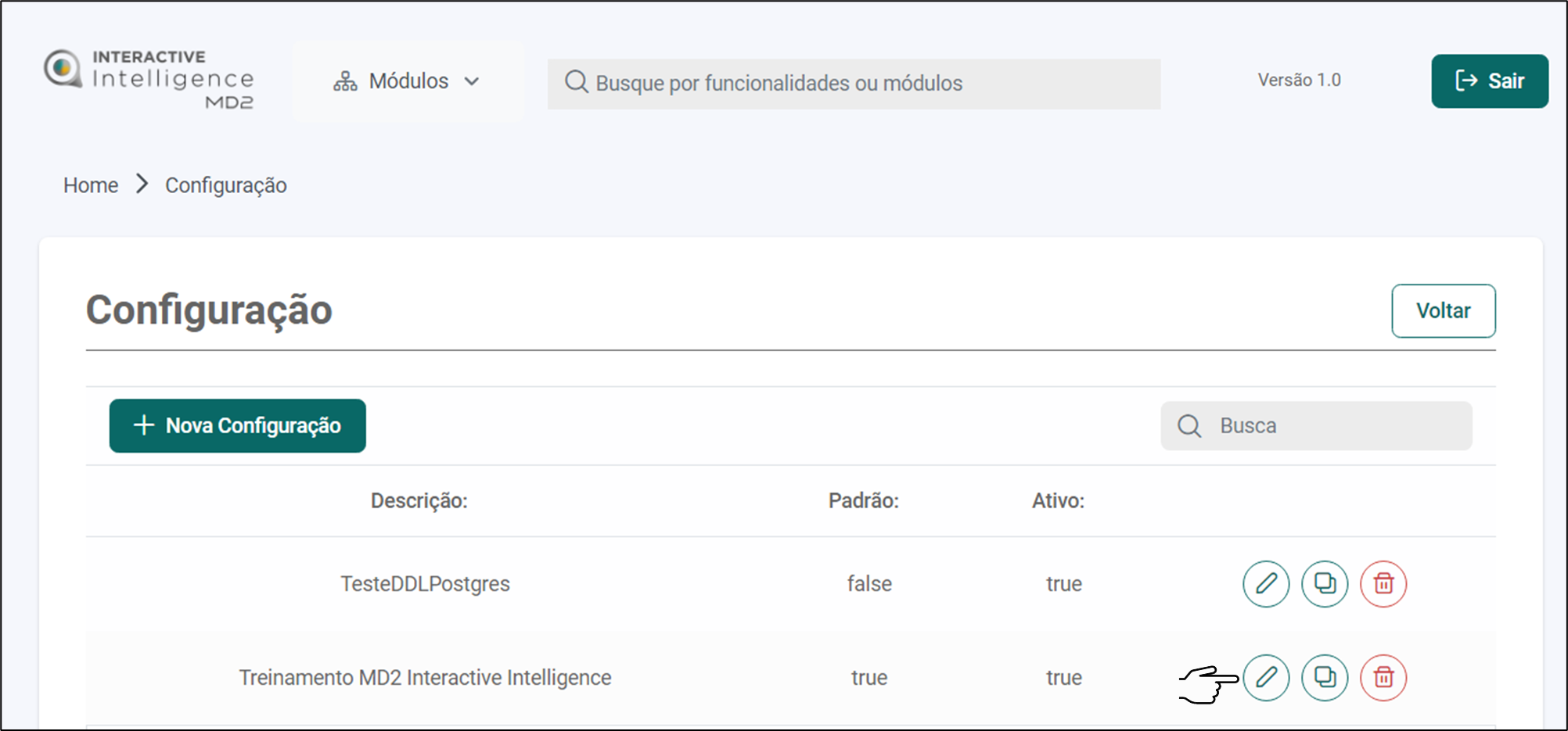 Para clonar uma configuração, o usuário deverá selecionar o ícone de copiar ao lado direito do nome da configuração.