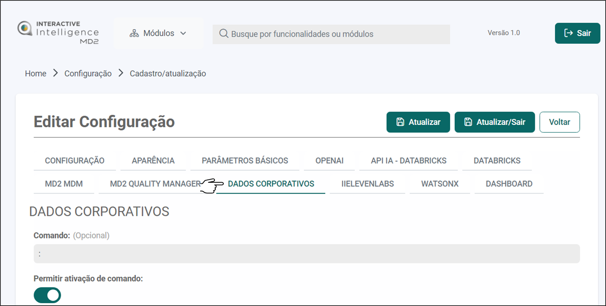- Permitir ativação de comando: Campo que habilita o uso do comando de dados corporativos no chat. Quando habilitado, se o usuário digitar somente o comando a aplicação entrará em modo de consulta de dados corporativos até que o usuário desabilite essa opção na tela de chat