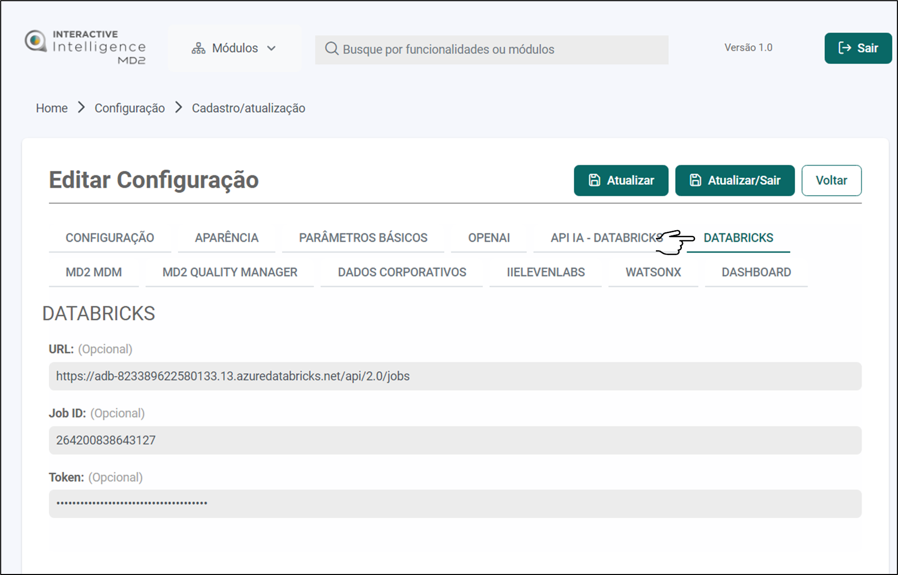 Descrição: Aba destinada a configuração de acesso a API da Databricks que retorna dados pessoais.