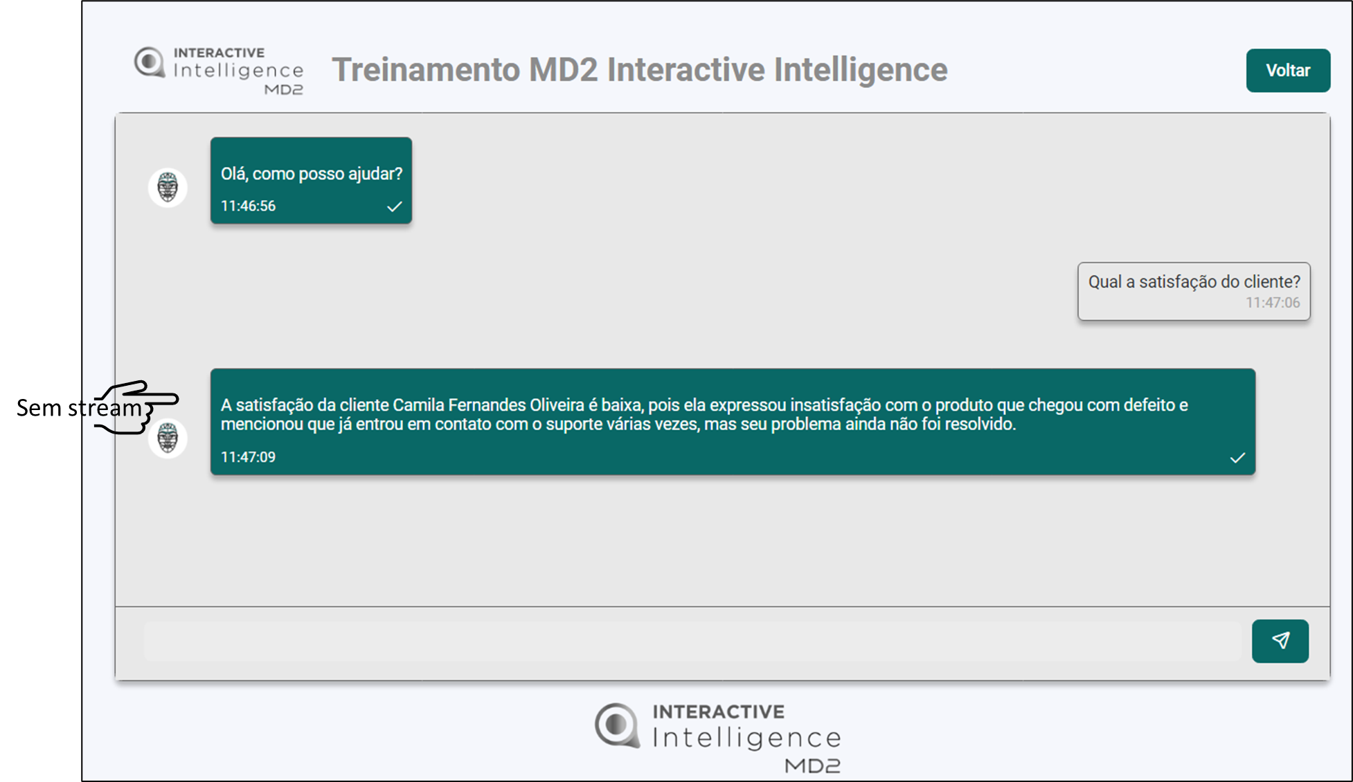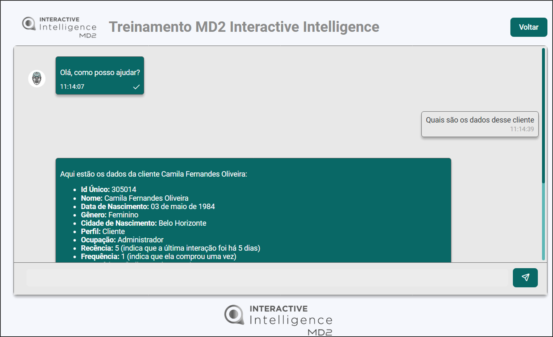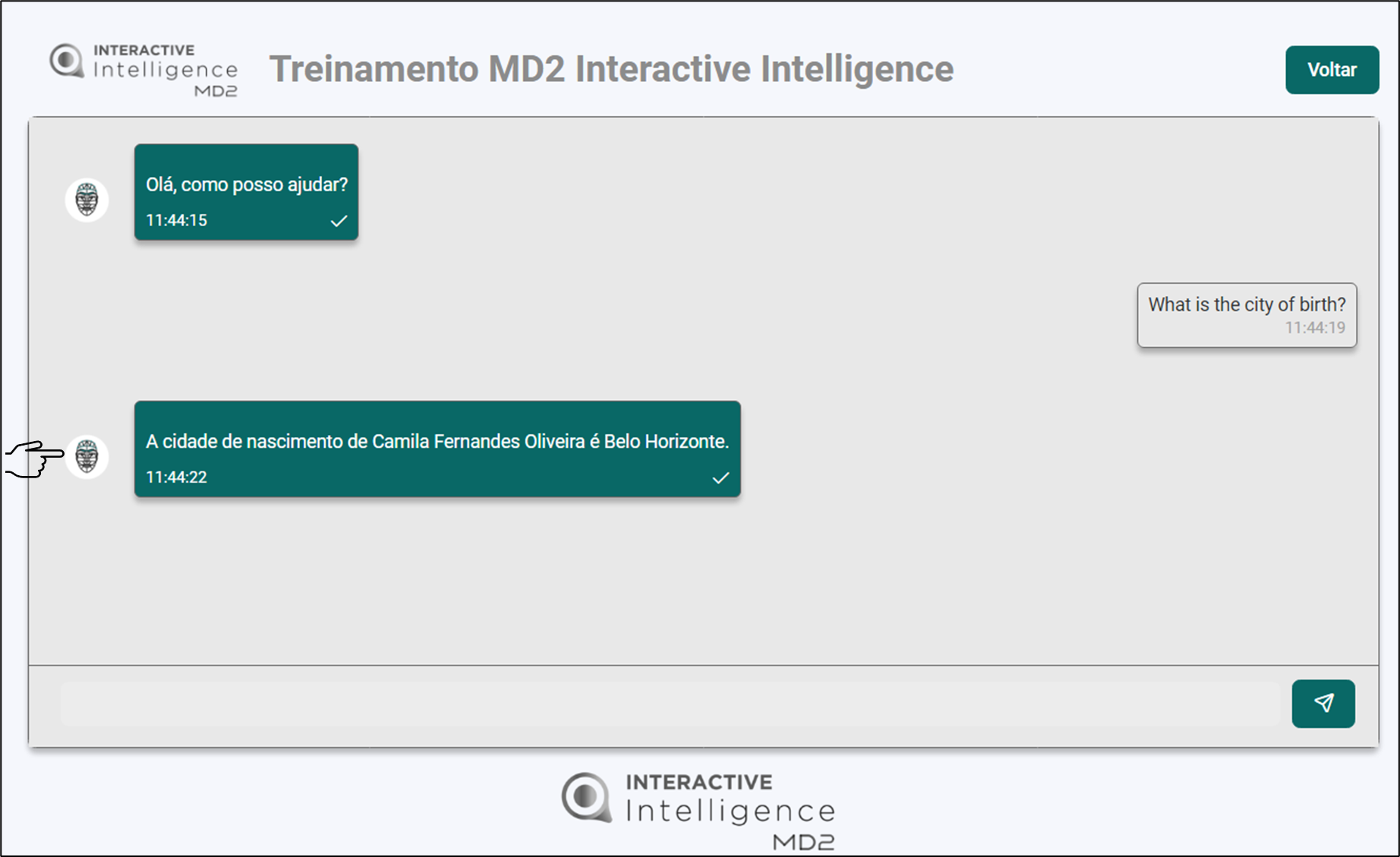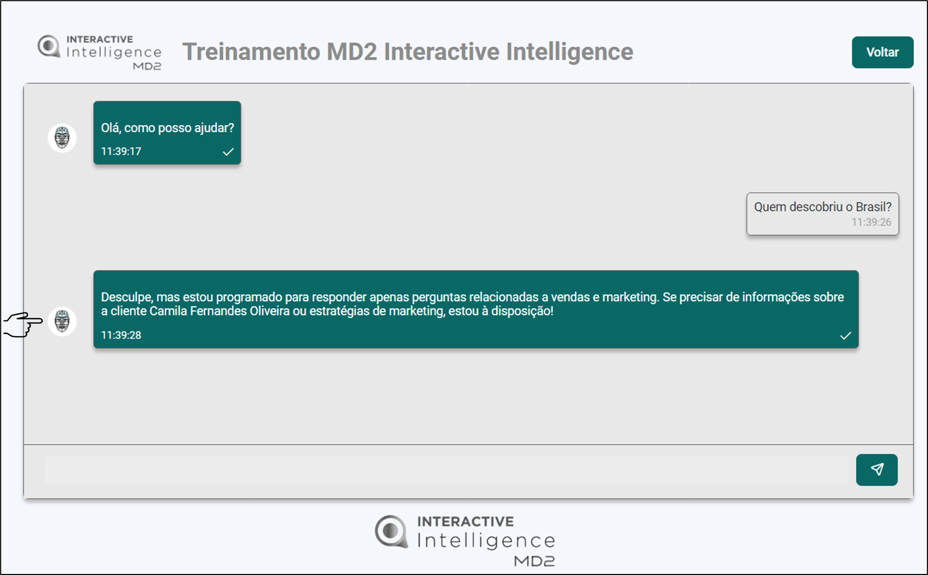 Habilitando a opção de histórico, podemos fazer perguntas em cima de interações passadas (de acordo com o número de mensagens definido no parâmetro Número de mensagens na memória do chat)