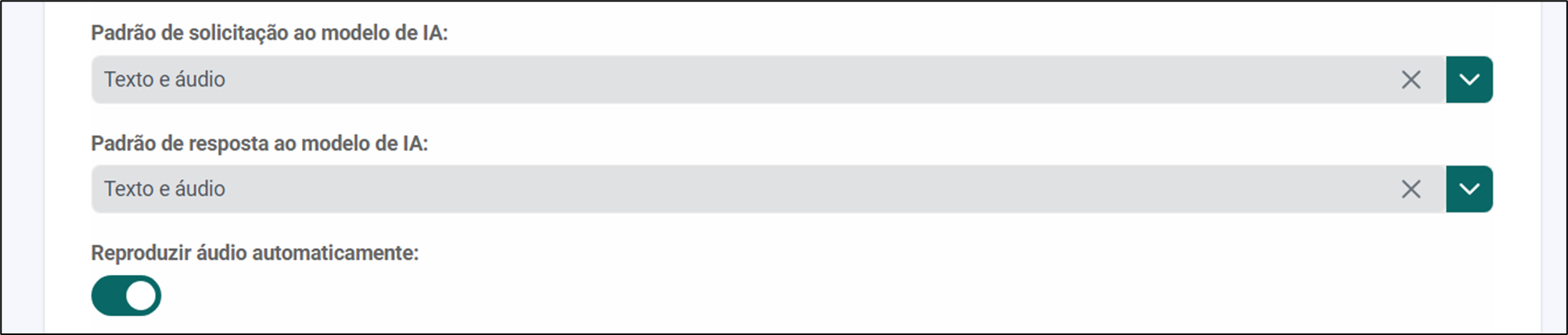 O assistente permite interação por comando de voz para perguntas e respostas. Para configurar essa funcionalidade, acesse a aba Parâmetros Básicos, selecione as opções 'Texto e áudio' nas seções Padrão de Solicitação ao Modelo de IA e Padrão de Resposta ao Modelo de IA.