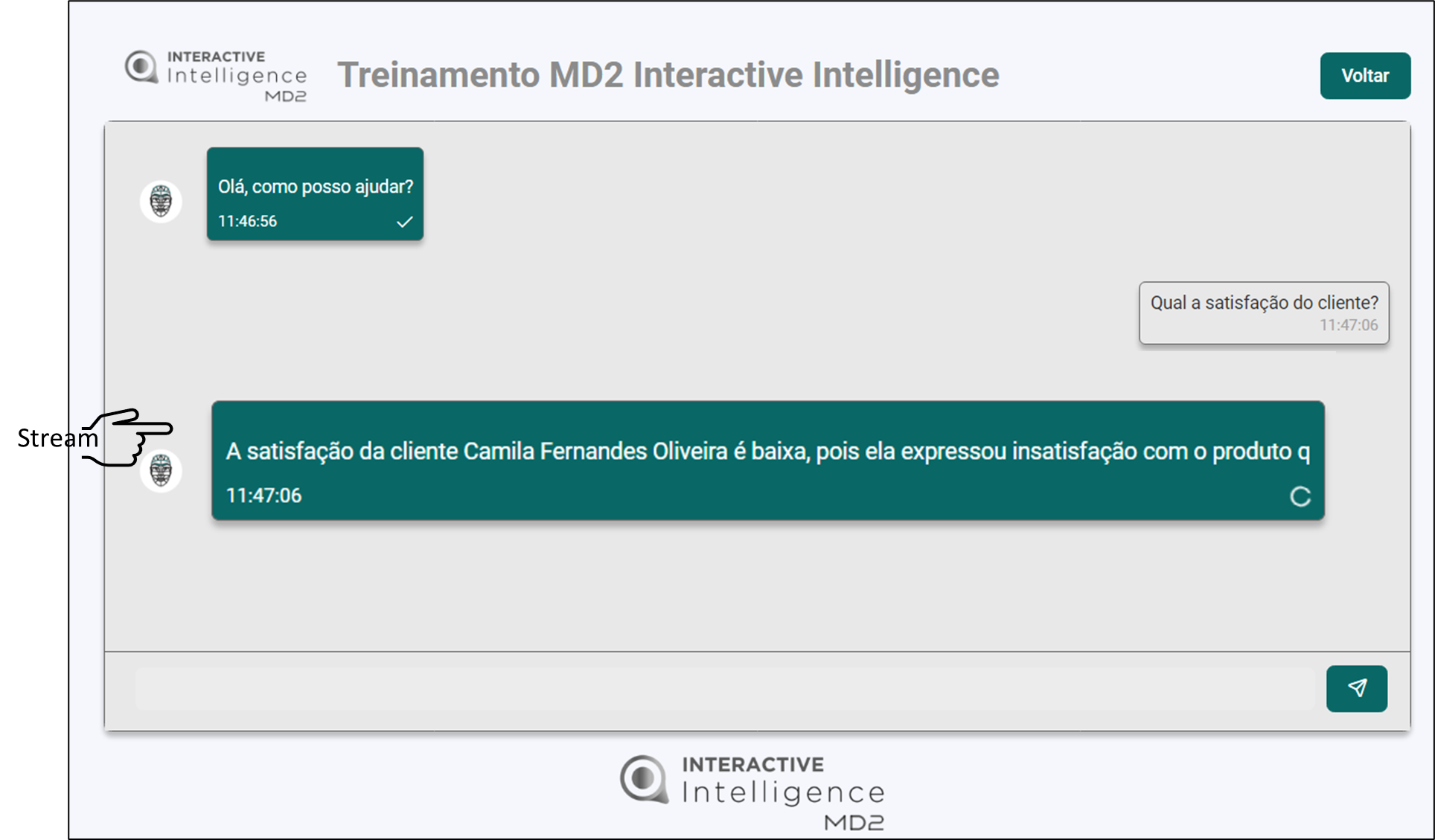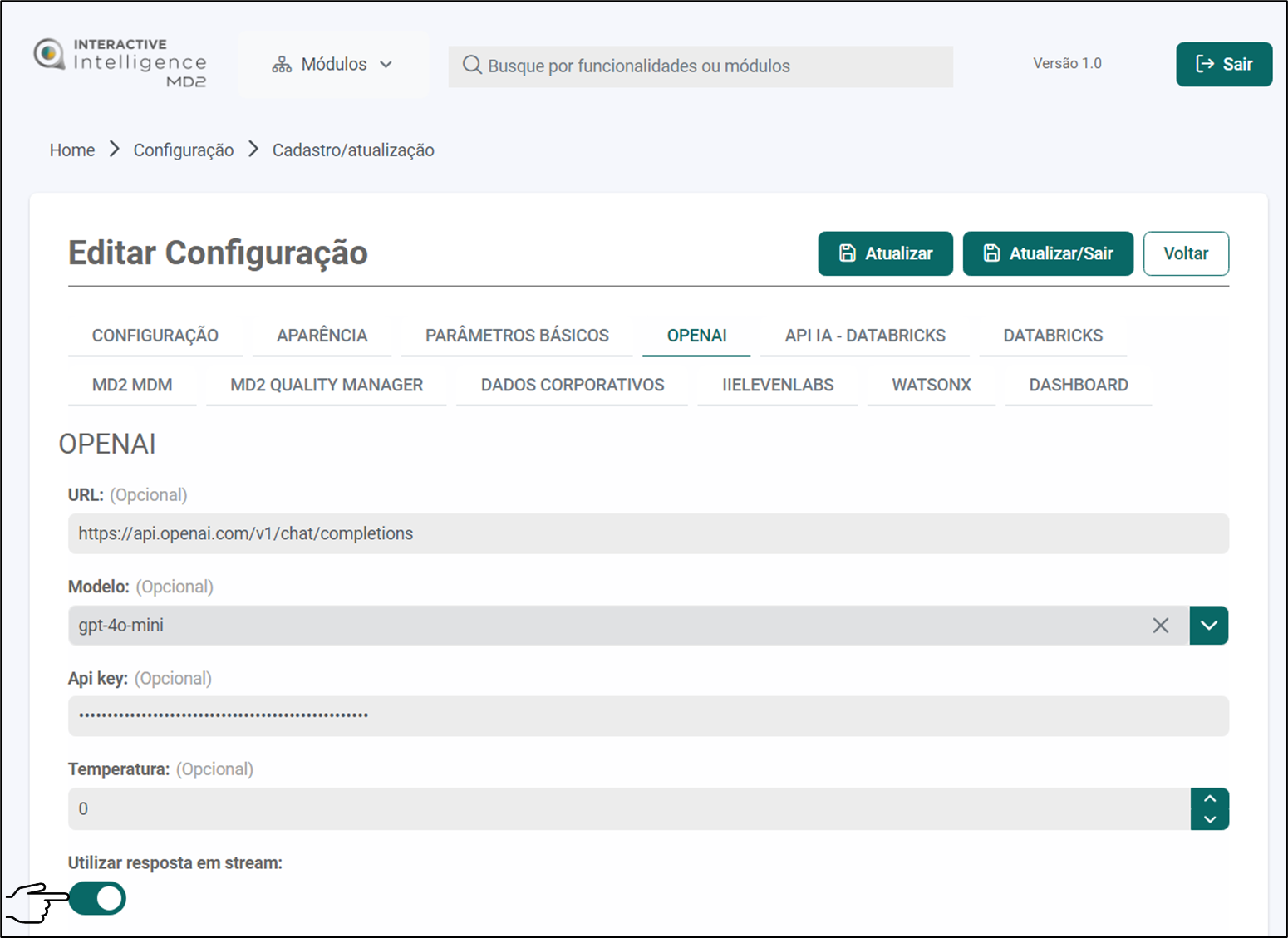 Na aba OpenAI, API IA - Databricks e Watsonx temos a opção de Utilizar resposta em stream permitindo ajustar a forma como a resposta é retornada.