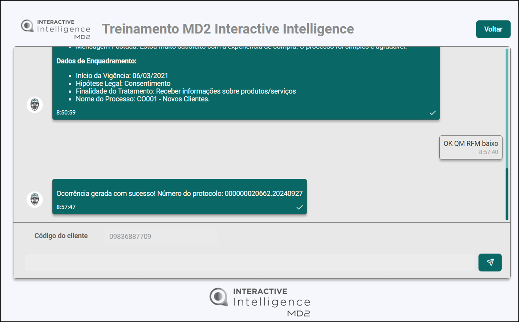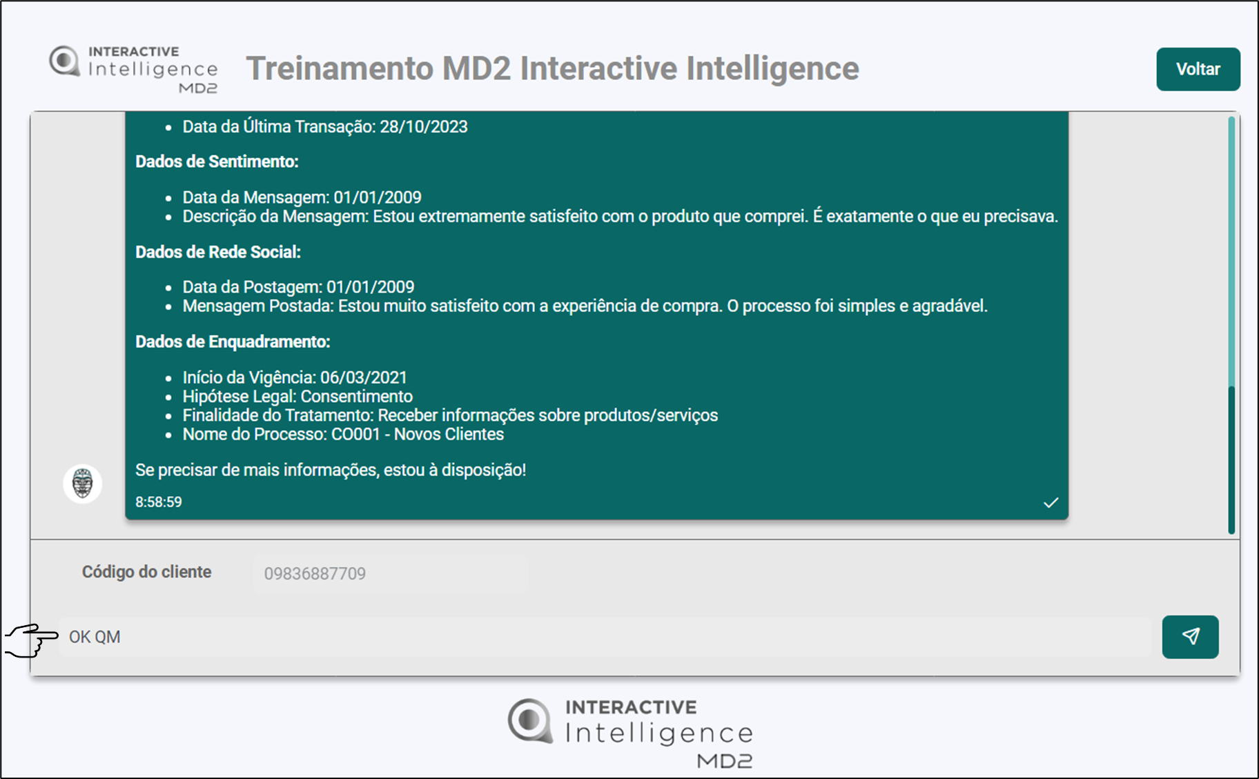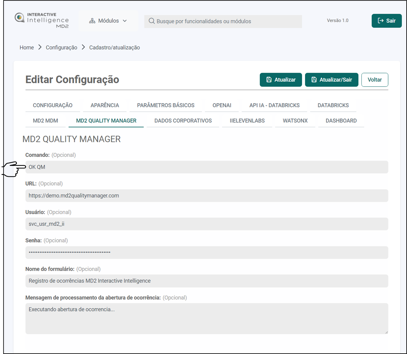 Insira o comando cadastrado no campo 'Prompt', selecione o botão 'Enviar' e aguarde a exibição da resposta no painel. No exemplo, o comando 'OK QM' cria uma requisição de ocorrência no MD2 Quality Manager com a descrição fornecida. Esse comando pode ser obtido na aba de configurações. Caso o acesso não esteja disponível, recomenda-se consultar o administrador do chat para verificar a palavra-chave e a ativação da funcionalidade.