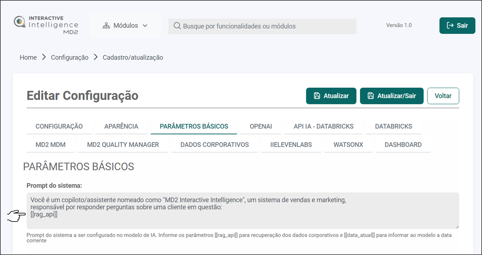 Para a criação de uma ocorrência, é necessário que o parâmetro [[rag_api]] esteja ativo no Prompt do Sistema na aba Parâmetros Básicos.
