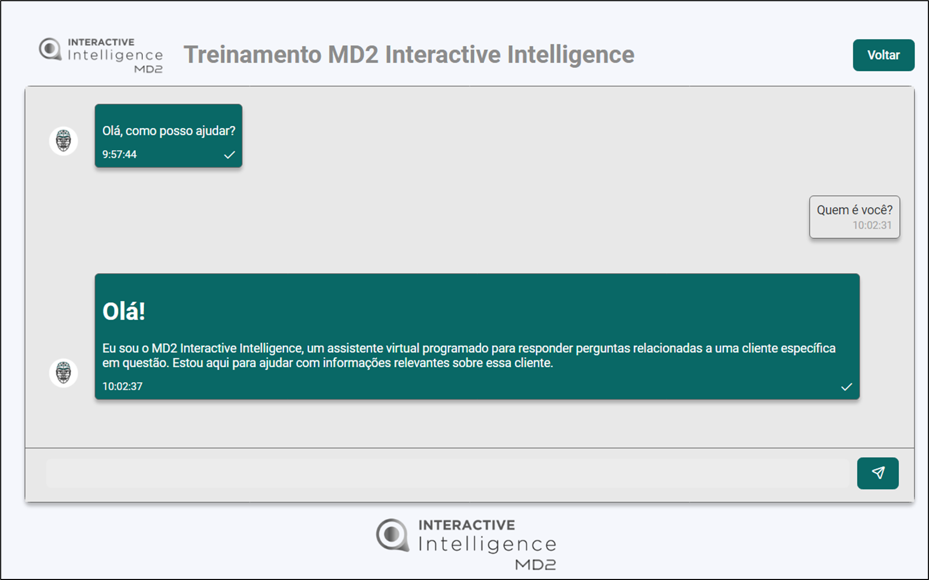 O MD2 Interactive Intelligence é um assistente que opera com base em regras predefinidas, oferecendo respostas baseadas em palavras-chave ou comandos específicos. Ele entende o contexto do negócio e responde a uma ampla gama de perguntas e comandos definidos pelos administradores.