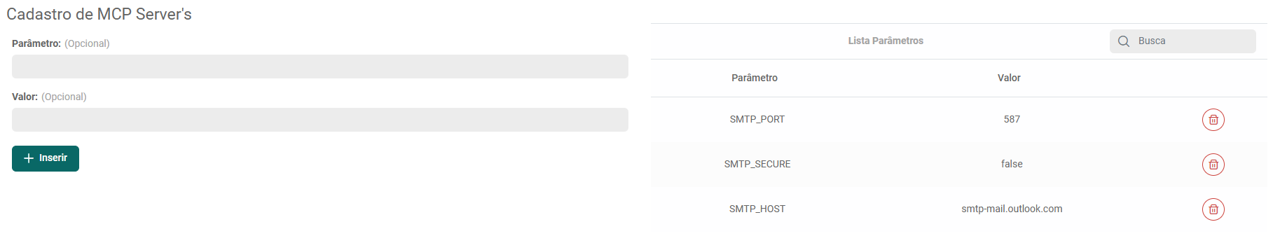Após preencher os campos "Parâmetro" e "Valor", clique em "+ Inserir". Após cadastrar todos os parâmetros, clique em "Atualizar" para salvar o cadastro do MCP Server.