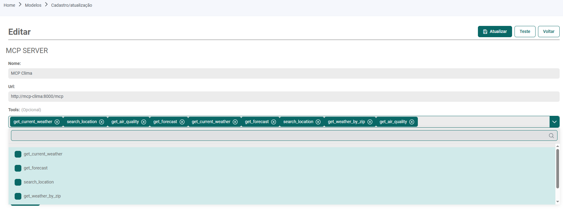 - URL: Endereço URL que o MCP está disponível. Ex.: "http://clima.empresa.com/mcp"