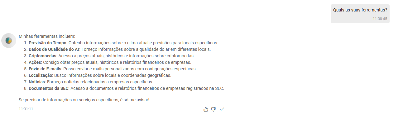 Após estas operações, o MCP Server fica disponível para o usuário. Para validar o funcionamento, o usuário pode interagir no chat com a frase "Quais as suas ferramentas?". A resposta deverá descrever as operações do MCP Server: