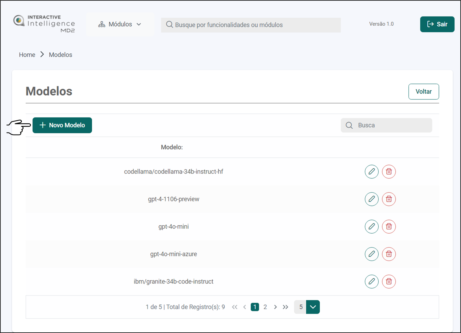 Para cadastrar um modelo na aplicação, o usuário deverá clicar no botão “Novo Modelo”.