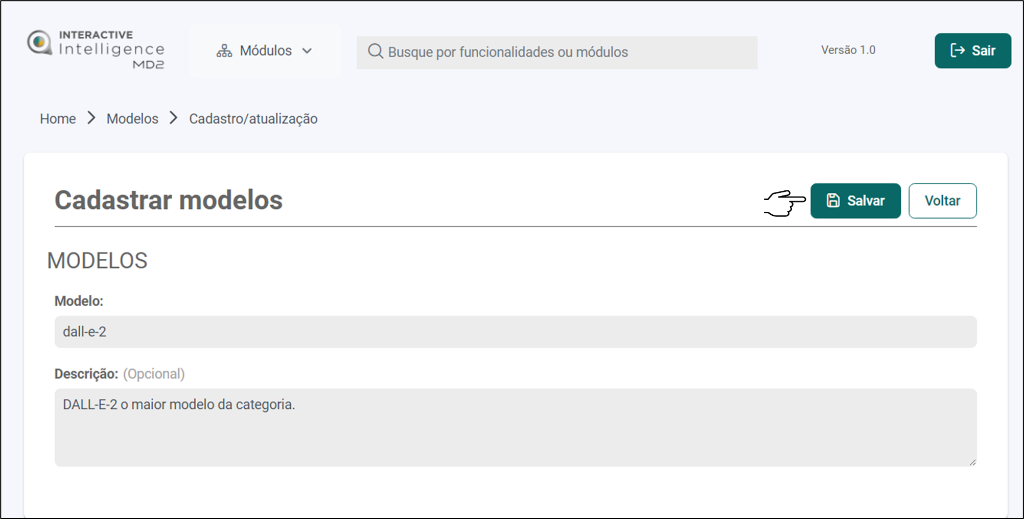 Descrição: O MD2 Interactive Intelligence disponibiliza uma interface para o cadastro dos modelos LLMs (Large Language Models ou Grandes Modelos de Linguagem). Com os modelos cadastrados, a aplicação pode interagir com esses modelos para fornecer respostas precisas e valiosas, conforme as necessidades dos usuários. O acesso ao cadastro de modelos está limitado ao administrador, pois se trata de uma informação crítica para o correto funcionamento da aplicação.