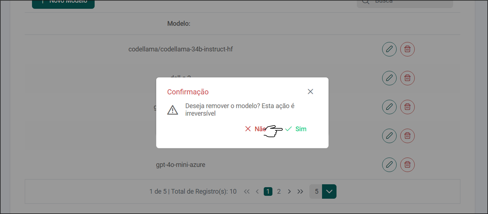 Em seguida, aparecerá uma tela para confirmar a exclusão do modelo. Caso o usuário deseje prosseguir com a exclusão, basta clicar no botão Sim.