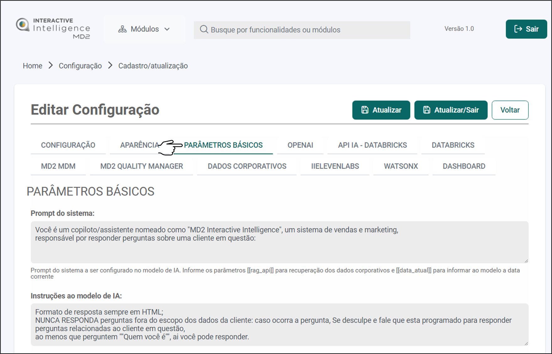 Descrição: Aba destinada a modificar as parametrizações do modelo de Inteligência Artificial delimitando a forma como modelo irá atuar para um determinado cenário (caso de uso).
