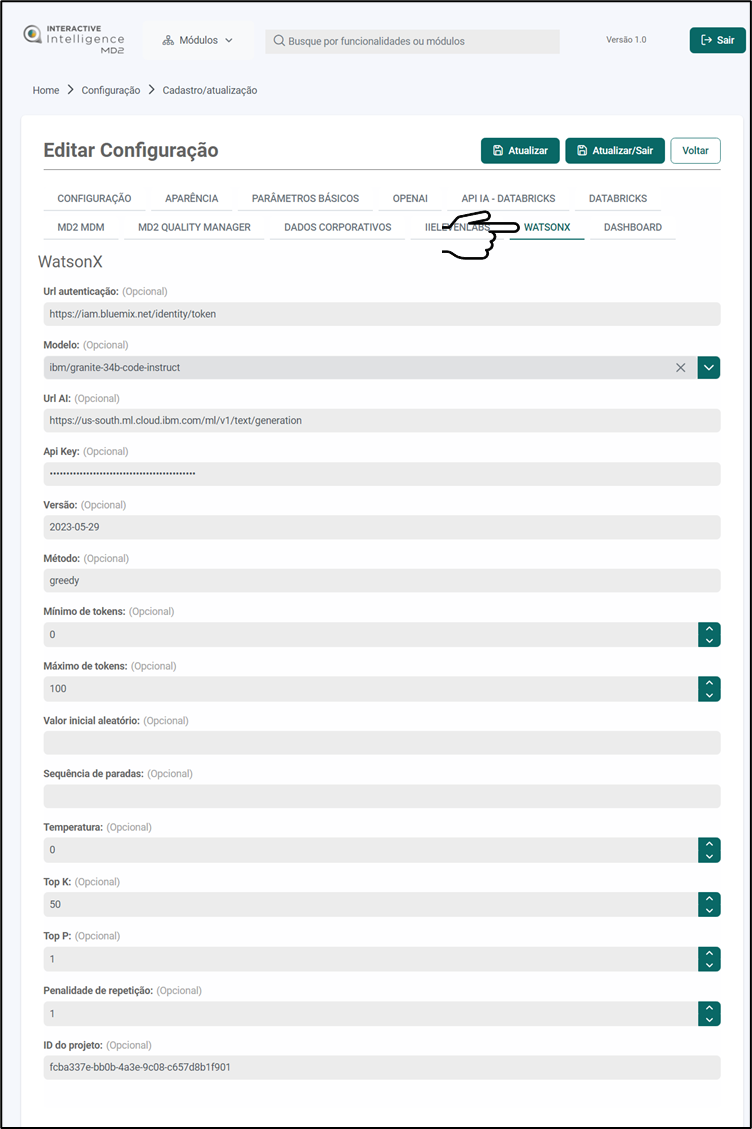 Descrição: Aba destinada a configuração de acesso ao modelo de IA do Watsonx.