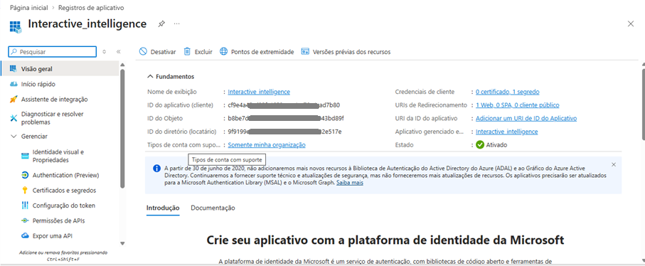 2 - Na opção "Visão Geral" do aplicativo criado anote os valores gerado para o Client ID e Tenant ID para serem informados na configuração do Selbetti II