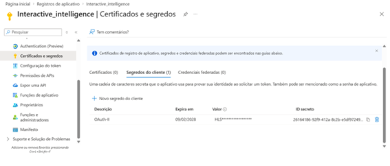 4 - Cadastre a chave de segurança "Client Secrect" no menu lateral esquerdo na opção "Certificados e Segredos". Anote para informar na tela de configuração no Selbetti II